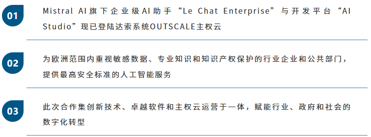Mistral AI的两款最新产品——企业级AI助手“Le Chat Enterprise”与集工具、模型与基础设施于一体的“AI Studio”平台,现已正式登陆达索系统的OUTSCALE主权云,在满足最高级别的机密性和安全标准的同时,为欧洲的AI应用提供高性能模型。