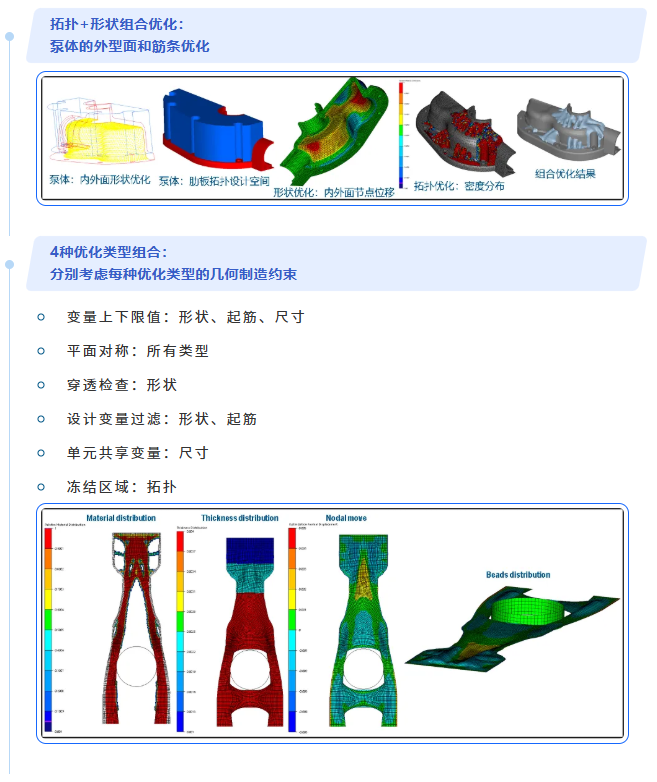 结构优化:具备拓扑优化、形状优化、尺寸优化、起筋优化模块。支持材料、接触、几何非线性。支持疲劳耐久性能的优化。支持子结构、子模型优化。支持多模型、多工况优化。支持热拓扑优化。